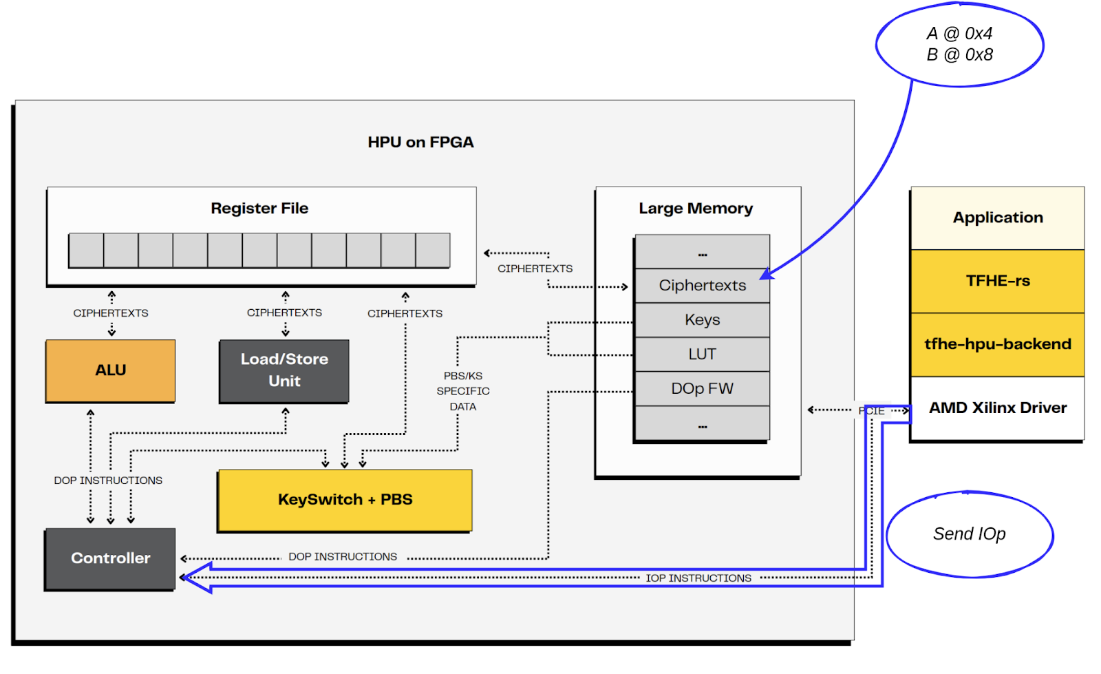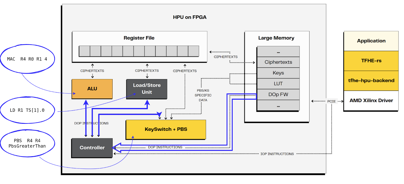 At first glance, the HPU looks like a simple CPU: it loads instructions, processes data, and produces results. The difference lies in what it computes on: instead of plain 16-, 32-, or 64-bit integers, the HPU works on FHE ciphertexts.
